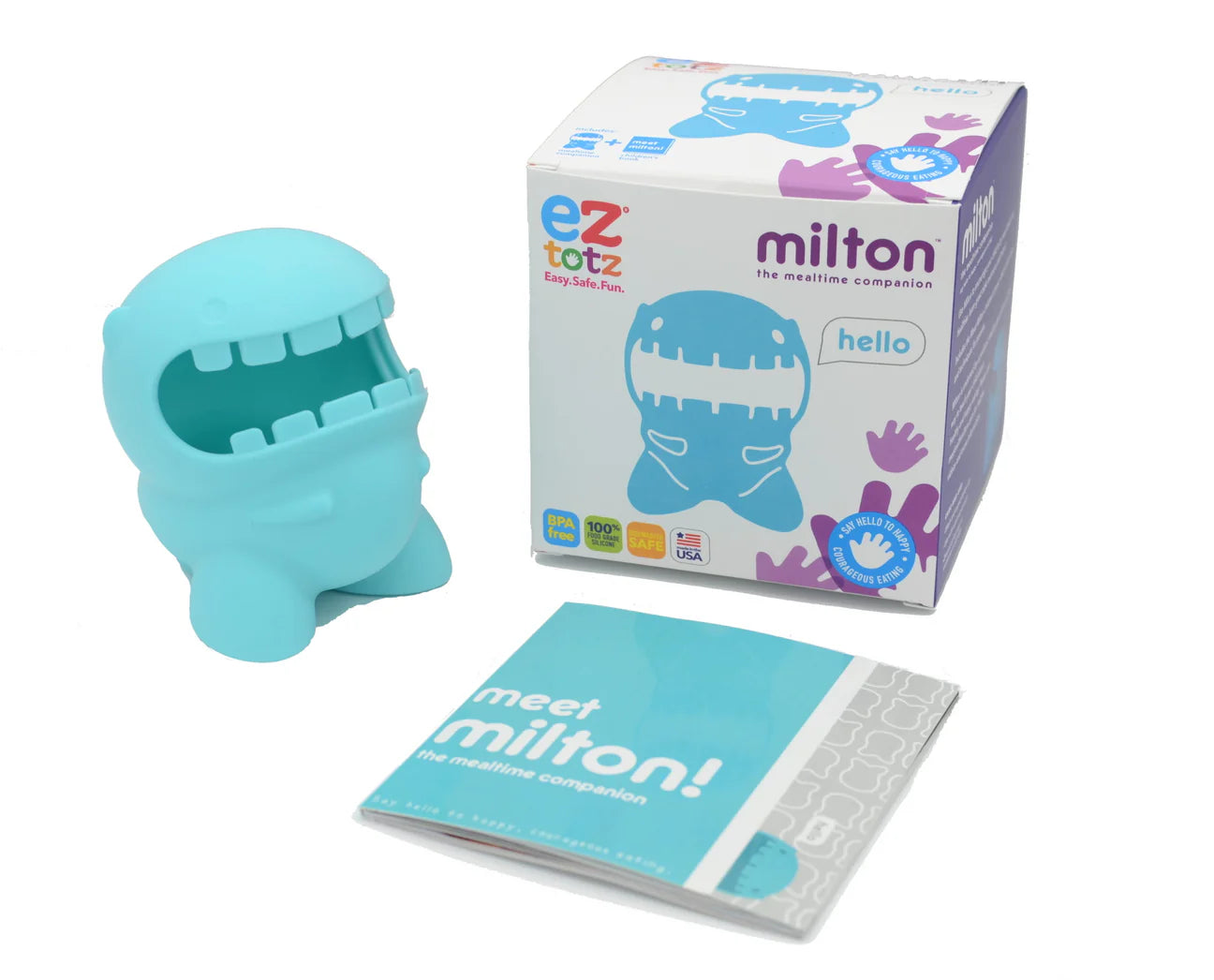 Place Milton beside your child at mealtime to introduce new foods. Ask them to feed Milton first, showing that even the “mealtime buddy” is brave enough to try different bites.